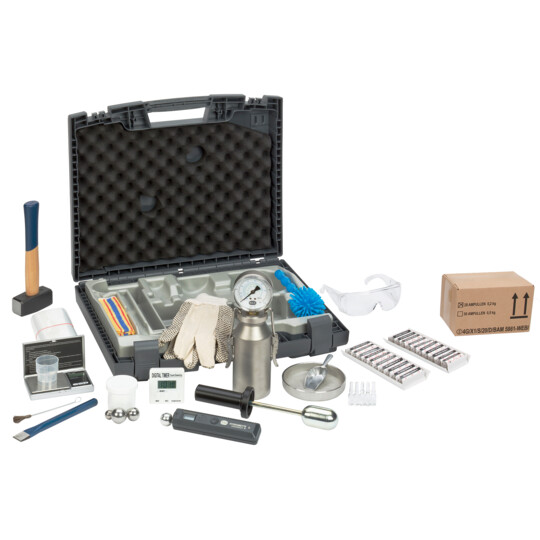 Das Kofferset CM-B Pro enthält ein Messgerät zur Bestimmung der Feuchtigkeit in abgebundenen Baustoffen und diversen anderen Materialien nach der Calciumcarbid-Methode.