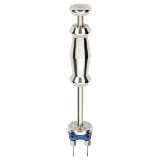 Sie wird am oberen Ende mit der flachen Hand fixiert und mit dem Griffstück durch hämmernde Bewegungen in das zu messende Material eingerammt.