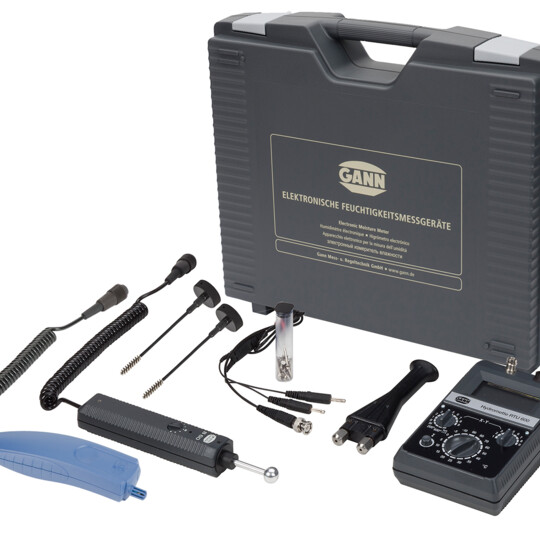 This set includes the M 20 drive-in probe for resistance-based moisture measurement of various types of wood and wood-based materials up to a thickness of 50 mm or for measuring in soft building materials. Also included are the M 25-100 brush probe pair for measuring building moisture in hard, set building materials as well as the B 60 capacitive building moisture probe with a built-in alarm function for non-destructive measurement in building materials. The package also contains the RF-T 28 EL climate probe for humidity and air temperature measurements.